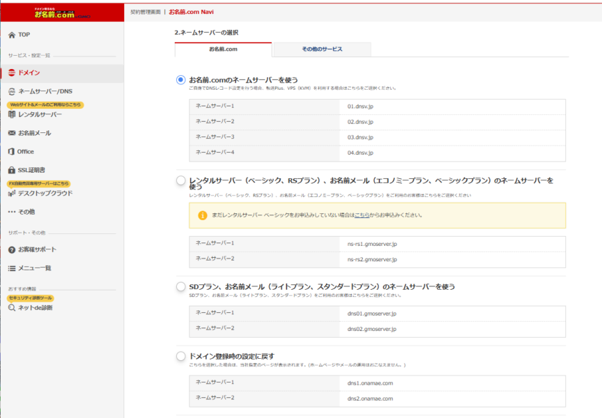 まずは、ドメインの行き先を管理している「ネームサーバー」を、お名前.comの初期設定に戻す必要があります。