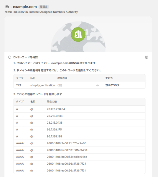 【画像A】Shopifyのドメイン設定画面に表示されたDNSレコードの指示内容