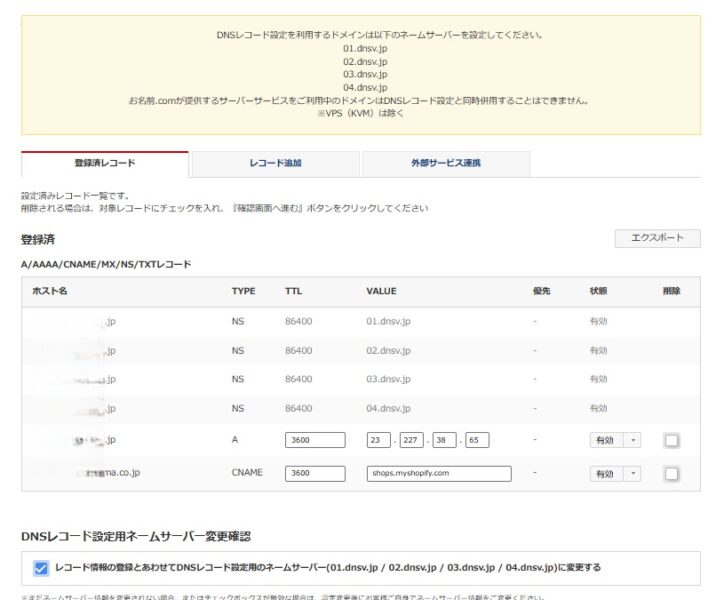 ネームサーバーの変更が反映されたら(数時間後)、いよいよShopifyの指示通りにDNSレコードを設定します。