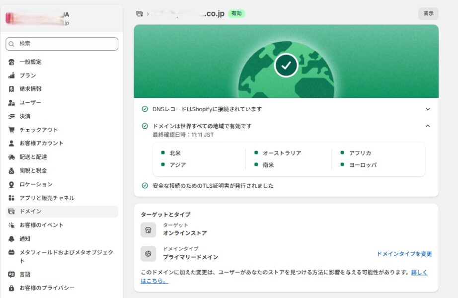 【STEP4】Shopifyで接続を確認&プライマリードメインに設定