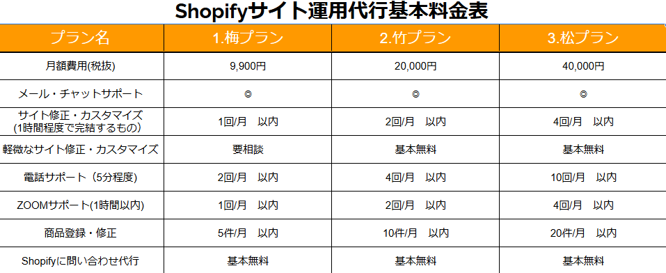 - Shopify構築後の保守(サイトのみ):10,000/月