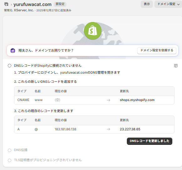 ドメインの行き先をShopifyに向けるための設定を行います。