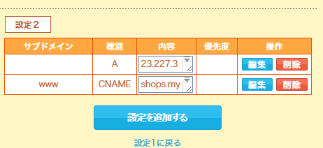 • 「設定2」で、Shopify指定のAレコードとCNAMEレコードを正しく入力する。
