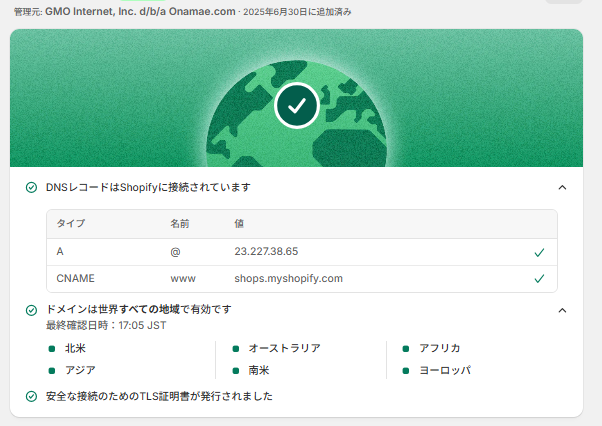ムームードメインでの作業お疲れ様でした。最後にShopifyに戻って最終確認をします。