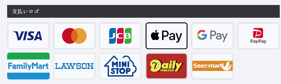 - 支払いロゴ自動生成:キーワードを入力するだけで公式ロゴを表示。PC6列・SP3列に自動で整列します。